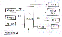 圖1是系統(tǒng)的硬件原理框圖,主要包括PIC16C72單片機、掉電檢測電路、脈沖采樣電路、存儲器、IC卡接口、閥門控制電路、顯示電路和電源電路等。為了降低功耗,芯片全部選用CMOS低功耗器件。