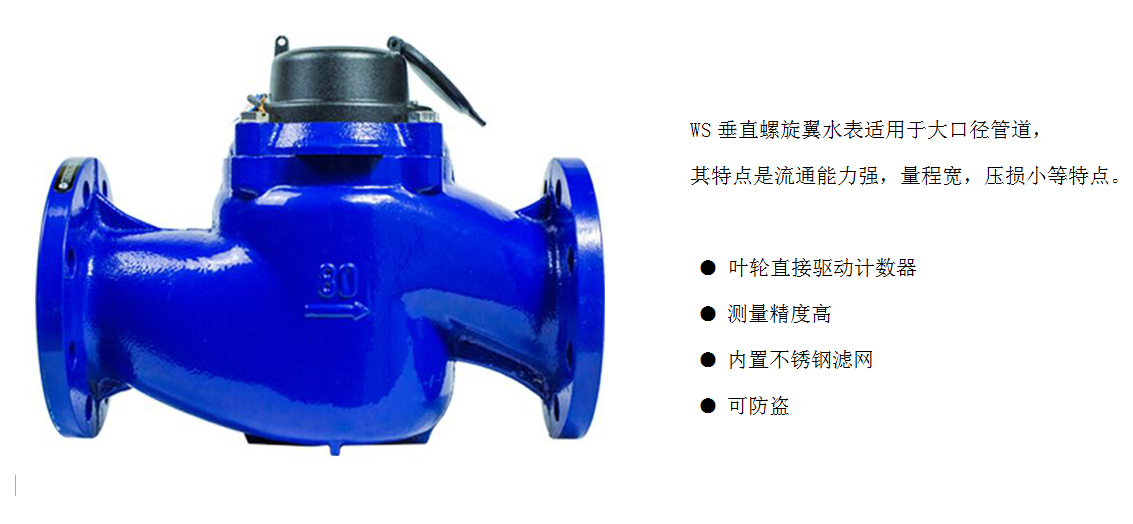 WS垂直螺翼式水表,垂直螺翼式水表,無蝸桿齒輪傳動結(jié)構(gòu),葉輪直接驅(qū)動計數(shù)器,傳動效率高,始動流量低。